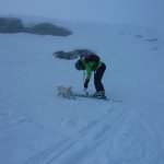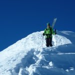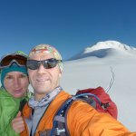 На вершине встретили идущую навстречу группу, которая шла с юго-востока. Они рассказали, что с той стороны снега для спуска нет, надо идти пешком. В результате, мы решили спуститься по красивому совершенно нетронутому юго-западному склону. Первые в это сезоне!