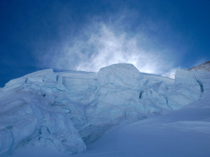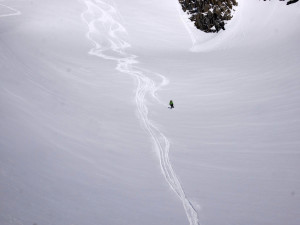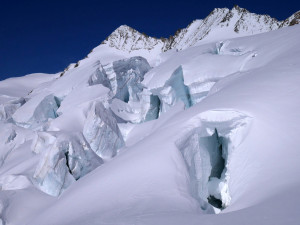 За предыдущую ночь все завалило снегом. Кроме того всю ночь завывал жуткий ветер, который так и не прекратился к утру. Планы были зайти по классическом пути на Gross Grünhorn: Boucle Grunegghorn >> Versant W (+1444 m / -1400 m). Вышли мы поздно, в 7:00, т.к. очень не хотелось покидать теплую хижину. Оказалось, что на нашу гору идет целая толпа. Мы не возражали, будет кому протропить дорогу. Мы пока еще не до конца акклиматизировались и совсем не рвались вперед. На леднике Glacier du Gross Grünhorn довольно много трещин, но у нас он был прекрасно засыпан снегом. Когда мы подошли к скальной части, что все, кто был перед нами уже надели кошки, связались и вылезли на скалы. Мы с Федей, решили, что кошки мы наденем, но связываться не будем, так быстрее. Скальная часть довольно простая. На вершине Gross Grünhorn (4043 m) мы были в 13:20. К нашему удивлению, на подъеме мы обогнали довольно много групп. А на спуске, всех оставшихся, и насладились потрясающим спуском по свежем пуху.