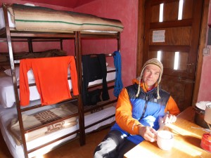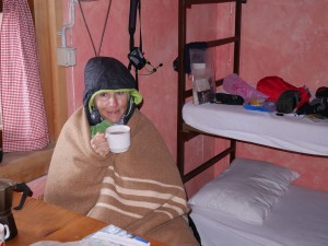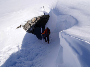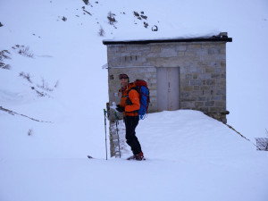 До следующего перевала – Passo di Valtendra (2431 m) мы тоже оттраверсили склон справа, практически не потеряв высоты. Дальше был долгий спуск в поселок Alpe Veglia. В поселке несколько домиков, но зимой там никто не живет. Хижина Refuge Arona (1769 m) находится в левом конце поселка и довольно высоко, так что лучше не промазать, иначе придется карабкаться наверх. Раньше в хижине была печка, но в этом году ее убрали. Видимо боятся пожаров. Но все равно хижина довольно уютная. Есть посуда, большие кастрюли, чтобы топить снег, теплые одеяла. Хижина рассчитана на максимум 9 человек. Мы, как водится, были одни.