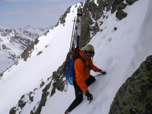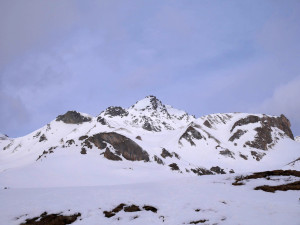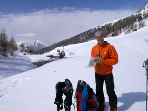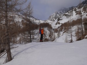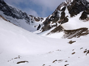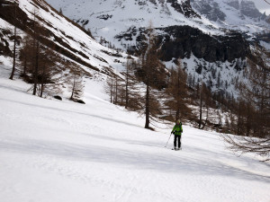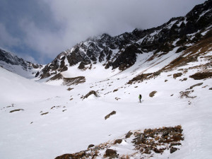 От поселка мы поднимались по правому берегу. Погода была не солнечная и склоны не растопило. Это позволило на максимально оттраверсить склон по правому берегу и минимально потерять высоту. В солнечный теплый день лучше пройти по низу долины, иначе будет лавиннопасно. На всем подъеме до перевала Scatta d’Orogna (2461 m) мы так никого и не встретили.