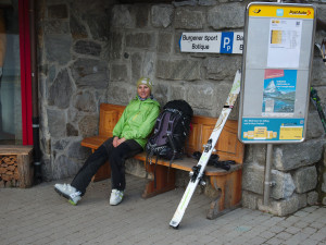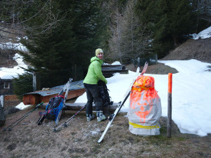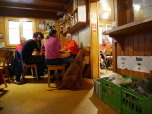 Это участь скитура мы уже делали несколько лет назад. Их Fiesch на автобусе доехали до поселка Binn (1400 m). Дальше автобус не ходит, но дорога есть. Можно попробовать поймать машину. Мы просто прошли на лыжах вдоль обочины до Fäld (1623 m). Дальше начинается подъем к хижине Cabane du Binntal (2265 m). Бинталь – очень приятная хижина. В прошлый раз мы там были вообще одни. Сейчас тоже народу было не много – парочка скитуристов и группа из 10 гарных голланских дивчин с гидом. Дивчины были на снегоступах и приперли неимоверную кучу еды – фондю, сметану, варенье…. и тд. И еще собаку за компанию притащили 🙂