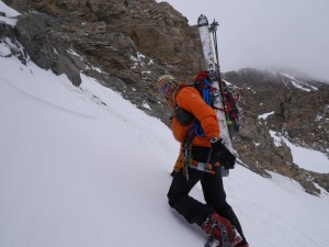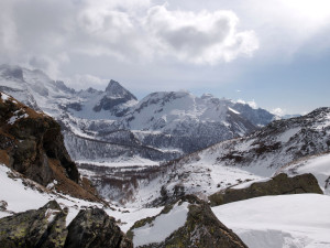 Утром погода была прекрасная – хорошая видимость, тихо и безветренно, солнышко, но не жарко. Максимально оттраверсили справа в сторону Chaltwasserpass. Перевал Chaltwasserpass (2770m) на подходе смотрится страшновато. На самом деле, ничего такого. Немного обледенелых скал. В прошлый раз мы пролезали в кошках. В этот раз даже кошки не понадобились. В принципе, если прыти много, можно зайти на Monte Leone (3553m). Но мы этого делать не стали, ни в прошлый раз, ни сейчас. Уж слишком мрачно выглядит гора и нависающий ледник.