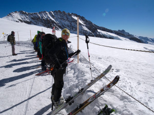 Погода была прекрасная, солнце, ветер несильный. Мы поднялись на Юнгфрау по классическом маршруту с Jungfraujoch (3471 m). Jungfrau: Par le Rottalsattel et l’arête SE (Voie Normale) (4158 m) (+1438 m). Это самый простой вариант восхождения. Но из Женевы, без акклиматизации даже это было непросто. Сердце выскакивало, дыхания не хватало. Но, на удивление, мы двигались довольно быстро, даже догнали группы, которые шли перед нами. На Rottalsattel мы оставили лыжи и поднимались в кошках. Мы не связывались, т.к. подъем был довольно простой. На вершине были в 15:00.