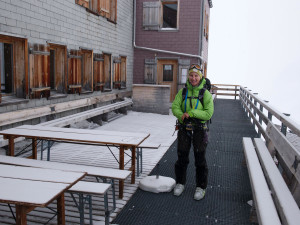 На верху было туманно. Снег в этом регионе совсем другой – мокрый и теплый. В Гризоне вообще климат сильно отличается от всей Швейцарии. Худо-бедно добрались в этой плохой видимости до Heidelberger Hütte (2264 m). Хижина очень большая, народу полно, но комфортно (для такой большой хижины) и кормят хорошо.