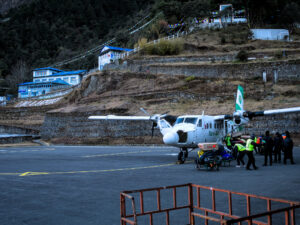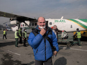 Утро было облачно. Ещё на кануне Мохан забрал наши билеты и каким-то Макаром разрулил все вопросы с самолётом. Прождав 3 часа мы всё-таки улетели в Катманду. Причем в этот раз за наш перевес мы заплатили 1500 рупий вместо прошлых 2500, хотя вес уменьшился несущественно (на 6 кг). Возможно тоже дело Мохана.