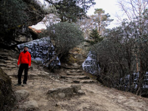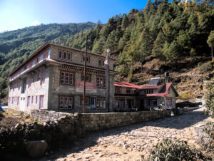 Итак сегодня в планах переход из Намче Базара (3440м) до деревни Tengboche (3870м) или Pangboche (3930м). Завтрак в 7:30. Самочувствие среднее. Вышли в 9:00. Дорога хорошая, то вверх, то вниз. То и дело заныриваешь в рододендроновый лес. Здесь должно быть невероятно красиво весной, когда цветут рододендроны. На подъема рододендроны лес сменяется сосновым. К 12:30 дошли до Tengboche (3870м). Монастырь оказался закрыт. Он открывается в 3 дня. Нам очень хотелось в монастырь, так что мы решили заночевать в Tengboche в Himalayas hotel. По моему, это единственная открытая лоджа здесь. Холодно, идёт снежок. В лоджии очень холодно, вода замерзает. Поели супа, напились чая и читаем книжки.