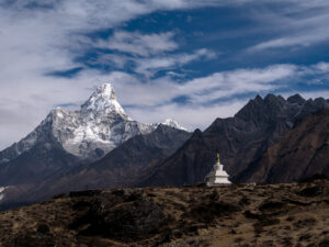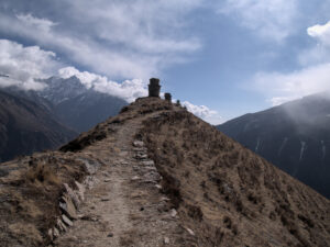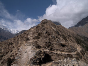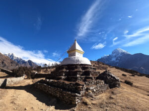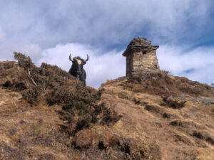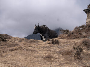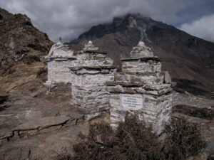 Никуда мы сегодня не вышли потому что Федя заболел. После завтрака я сходила в аптеку и магазин и купила ему таблеток от всего. Он остался болеть дома, а я пошла покорять местные просторы. Я хотела попробовать залезть на горку, где я видела флажки и мемориал. Названия я её не знала, позже выяснилось, что она называется Phund Peak (4200m). Прекрасная тропа, которая была на карте, оказалось козьей и я её быстро потеряла. Дальше пришлось карабкаться по курумнику и траве. Но в какой-то момент я вылезла на ребро и дальше все пошло проще. На ребре куча каких-то ступ, туров и тд. Из понятного есть мемориал Эдмунда Хиллари, Hillary Memorial Viewpoint, на 4011 м и Hillary Memorial Chortens на 4025 м. Это, то, что было обозначено на карте. Я прошла выше до какой-то пупырки с надписью Khund Peak (4200m) и решила, что на этом сойдёт. Вернулась дорогой попроще, которая отходит от Hillary Memorial Viewpoint и идёт вниз к монастырю в Кунде. За все время так никого и не встретила кроме нескольких яков. Получился нормальный акклиматизационный день с подъёмом на 4200м и набором высоты в 760 м.