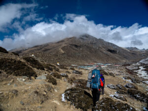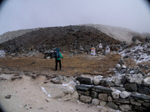 Сегодня по планам переход в Gorak Shep (5160м). Переход предполагается долгий, так что завтрак назначили на 7:00. Голова болит, таблетки не особо помогают, аппетита нет. Небо затянуто. Но потихоньку разошлось. Часть вещей мы оставили в лоджии, так что рюкзаки были полегче. За 3 часа дошли до Лобуче. Пока шли тучки растянулись и вышло солнышко. В Лобуче пообедали и оставили ещё часть вещей в Hotel Peak 15. Налегке пошли в Gorak Shep. У меня вообще рюкзак отобрали. Дошли часа за 2 медленным темпом. В Gorak Shep в лодже оооочень холодно, руки, пока держишь чашку, отмерзают. Ещё и с печкой в общей комнате что-то не так, она дымит внутрь комнаты. Вонища страшная, мы ушли пить чай в свою комнату. Все вещи пропитались этой вонью.