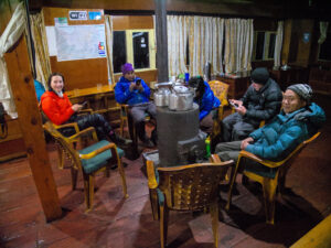 Вечером я рискнула принять душ, оказался вполне горячий. Вечером обсуждали планы на завтра. Наш первоначальный план был переход из Намче Базара (3440м) до деревни Deboche или Tengboche (3870м). Но наш портер посоветовал нам идти до Pangboche (3930м), потому что эта деревня стоит на южной стороне и там теплее. Вообще немного о нашем портере. Он не самый простой портер, он скорее трекинг гид, который несёт наши вещи. Я выше писала, что уговор с Риши был, что мы не пользуемся услугами горного гида и на горе сами по себе. Но мы его оплачиваем, так как это требуется для получения пермита. Зато Риши отправляет с нам гида, который несёт наши вещи. Зовут нашего портера Мохан и он очень ответственный. Следит за нами, чтобы мы никуда от него не сбежали. Селит нас в хорошие лоджи. Правда в хорошие, я проверила. Сначала мне показалось, что лоджи средние, холодные и неуютные, но по факту оказалось, что это одни из хороших лоджий. Хотя все они нифига не уютные. Даже общее помещение-столовая хоть и красивая, но холодная. Печка её не прогревает ни разу. Может это от того, что народа мало. Я не привереда и где только не жила. Но наши Альпийские неохраняемые рефьюжи или биваки на много приятнее и уютнее местных лоджий. Во первых там всегда тепло, даже зимой и даже если нет печки. Да, в начале холодно, но потом ты нагреваешь собой комнату и все отлично. Здесь же в лоджии холоднее, чем на улице.