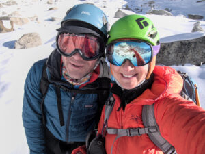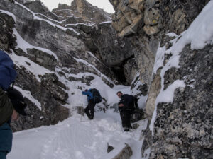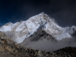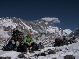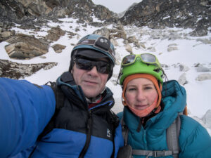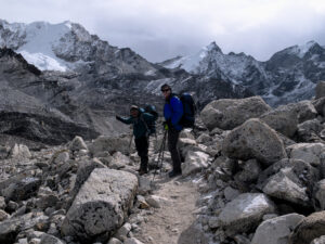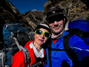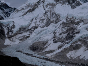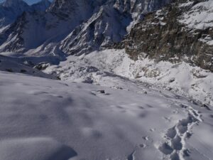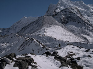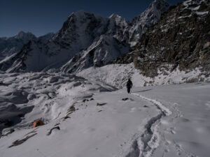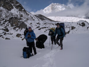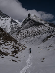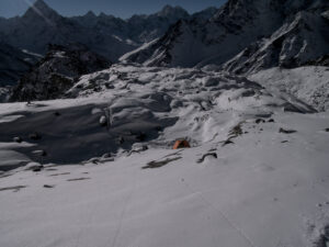 Спали прекрасно, вообще мы спим с каждой ночью лучше и лучше. На утро все ещё не развиднелось. Мы коллективный разумом решили выходить после раннего обеда, те в полдень. Вышли вшестером: мы с Федей, Саймон с Нуру, и Мохан с Эвелин. Тропу к базовому лагерю замело, причём так, что местами по пояс. Соответственно тропу найти сложно. В принципе периодами попадаются туры, но отмечать тропу турами здесь явно не принято. Мохан дошёл с нами до места, которое называется “базовый лагерь”, выше него тропа забирает круто вверх. Мохан отдал нам вещи и пошёл с Эвелин вниз в Лобуче. А мы, груженые пошли вверх. Ну что сказать, тяжело, когда круто и снег много. Нура и Саймон тропили большую часть пути, что нам очень помогло. Они шли налегке, так как им лагерь должны были принести и поставить портеры. Нура помог мне и взял у меня верёвку. Последний вылаз довольно не очевидный и без кошек стремный, особенно с тяжёлыми рюкзаками и по обледенелым скалам. Нура вылез и подстраховал нас верёвкой. На высоте 5200м мы разделились. Нура с Саймоном пошли вниз к озеру, где у них должен был быть поставлен лагерь. А мы решили не спускаться и поставить палатку в ямке наверху. В общем до high base camp мы дошли за 3 с половиной часа. Пока утоптали площадку, поставили лагерь почти стемнело и мы толком не успели посмотреть путь. Да оно и не очень понятно – скалы занесены снегом. Вечером было холодно, я согревалась с помощью бутылок с водой в спальнике. Но мы быстро нагрели палатку и спали нормально.