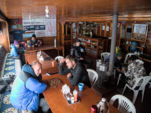 Проспали до 9 утра, те 12 часов. Спать мы тут научились. Небо затянуто, но пробивается солнышко и нагревает постепенно наш замерзший мир. Нам бы надо было бы просушить наше барахлишко. Ждём завтрака и смотрим погоду. Снега не обещают, но обещают сильный ветер и особенно 3 января, те в день, когда мы планируем идти на гору. Ну и особенно холодную ночь – 30С. Мохан больной, но вроде обещал найти нам портеров до базового лагеря. Ох, все это какой-то не добавляет мотивации.