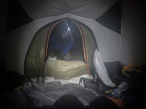 Ночью было тепло. Правда в пуховых штанах и в спальник и под одеялом. Заснула я быстро и рано, но вот к полночи сон прошёл и дальше я до утра вертелась, читала, писала отчёт, пила чай и тд.