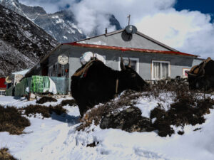 Всё засыпало снегом, очень красиво. Настоящее Рождество. Самочувствие – у Феди хорошее, у меня – среднее, но я борюсь с болезнью. Завтрак дали хороший. Вышли в 9:00, идётся не бойко, но до Dingboche (4400 м) мы дошли за 4 часа, что неплохо. По дороге встретили гида, Нуру, который шёл к своим клиентам. Они тоже собирались идти на Лобуче. Это очень порадовало, а то мы тут совершенно одни. В Dingboche заселились в Mountain Paradise hotel – очень тёплую лоджу на солнышке. Прям реально тепло, даже не верится. После обеда опять пришла туча и снег.
