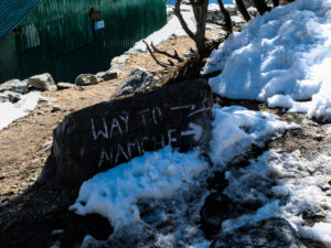 Ура, утром пришёл Ануп. Оказалось, что он крутой высотный портер. Был 3 раза на Эвересте. И сейчас в команде немца, который с нашим агентством Сатори Адвенчерс собирается идти соло на Эверест зимой по какому-то сложному маршруту. Они переживают непогоду в Пирамиде. Ануп взял нашу 25 кг сумку и пульнул с такой скоростью, что я их с Федей еле догоняла. За полтора часа они до бежали до Чукунга. Потом мы понеслись с той же скоростью в Base camp. Снега все ещё много, но тропу уже кто-то протропил. Недалеко от Чукунга обогнали группу из 3х тайцев с гидом и портером. Они собирались тоже на Айленд пик. Честно говоря выглядили они не очень: шли совсем медленно, одежда фиговенькая и тд.