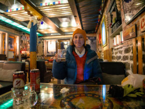 Заказали супа, выпили пива для поднятия настроения и вдруг видим, идёт наш Мохан. Сумку ему помог донести парнишка из лоджи, где мы ночевали в Лобуче. Коллективный разумом лечили Мохана. По всем признакам у него развилась горная болезнь: у него уже несколько дней низкий кислород – 60-65%, болит голова, отёк. Хорошо хоть он сошёл ниже в Дингбоче. Мы его пытались уговорить идти вниз, хотя бы на пару дней, но он уперся.