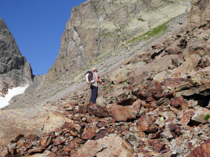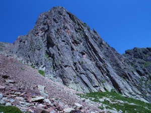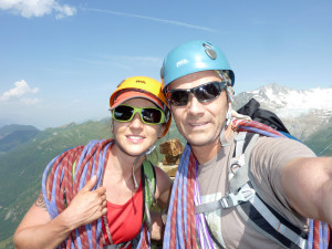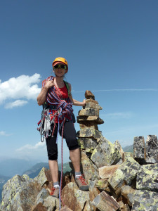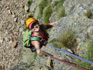 До начала маршрутов идти довольно далеко, 2-3 часа, так что не набегаешься. Мы решили поставить лагерь под скалами и ночевать наверху. Можно начинать подниматься от паркинга поселке Вuet или от мостика вдоль русла L’Eau Noir. Второй вариант короче, но тропа там хуже. С вещами лучше идти от Buet. В первый день мы забросились наверх и пролезли Voie Parat-Seigneur (L1-5b, L2-5a, L3-5b, L4-5b, L5-6a, L6-4c, L7-5a, L8-4c, L9-3b, L10-3b) на Aiguille de Praz-Torrent, что называется “grand classique”. Маршрут частично экипирован, те есть станции и кое-где забиты старые крюки, что приятно. Вот тут начались первые проблемы. Скальные тапочки у меня были практически новые. Я в них уже лазила, но мало и давно. Тапки хоть и предполагались для длинных маршрутов, а не для спорта, но все равно ногу наминали. Еще и на сильном солнце резина нагревается и тоже ногу не расслабляет. До вершины я уже долезала “сцепив зубы” . Сам маршрут красивый и нескучный. Виды потрясающие на весь массив Монблана. Спускались мы пешком через вершину. Спуск довольно геморройный. Если умеешь спускаться по крутой не гомогенной сыпухе, то наверное лучше по ней. Федя спускался по сыпухе. Я лично выбрала скакать по нестабильным красным камням с большими пауками. Камни, размером от ящика до комода, периодами скакали вместе со мной. К концу спуска с пауками я уже подружилась, и это при всей моей нелюбви к этим зверям.