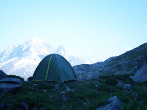 Для лагеря есть несколько возможностей. Вообще Aiguilles Rouges – это заповедник и ночевать там нельзя. Но это простым смертным, а скалолазам – можно! Написано в правилах от 1974 года (стр. 2 Арт.8)! Лучше всего ночевать, где стояли мы – в лагере под Aiguille de Mesure, обозначенном в книжке. Там есть ровная площадка под маленькую палатку. Рядом есть место для бивака на 2 человека под большим камнем и “столовая”: сооруженный из камней стол и стулья. Еще выше есть место для бивака на плоском камне, обозначенное зеленой краской. До ручья идти минут 10 в один конец. Лучше взять с собой пару пустых бутылок, чтобы было в чем таскать воду. У нас было 2 кэмелбэга на 5 л в сумме и 2 бутылки по 1.5 л.