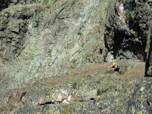 Во второй день было решено лезть маршрут Les noces d’Etain (TD inf. 330m) (L1-5b, L2-5c, L3-5a, L4-5a, L5-5c, L6-5c, L7-5b, L8-6a, L9-6a, L10-5b, L11-5c+) на Doigt de Mesure. Уже после первой веревки я поняла, что вчерашнее лазанье не прошло даром и ногам кирдык. Федя меня ободрил, сказал что после третей веревки будет хорошая станция и, если что, сдюльферяем вниз. На второй веревке мне уже захотелось сдюльферять немедленно пусть и с потерей карабина. Повезло что третья веревка была совсем простая и я как – то оклемалась. Дальше почти все станции были спусковыми так что сдюльферять можно в любой момент. Решили пролезть еще длину. Но сместились на другой маршрут, Le Colosse Aux Pieds Agiles (TD 350m) (L1-5c, L2-6a+, L3-6a, L4-5c, L5-5b, L6-5c, L7-5c, L8-4b, L9-5a, L10-5b, L11-5b+, L12-2b, L13-6a). Он нам показался более приятным и логичным, хоть и посложнее. Дальше после каждой веревки Федя спрашивал “Как ноги? Дюльферяем вниз?”. Я неизменно отвечала – “Ноги фигово, но пока лезем вверх”. В общем так мы все 13 веревок и пролезли. Сфоткались на вершине и начали искать спуск. Спускаться лучше по маршруту Les Noces d’Etain – веревка идет более прямо и нет траверсов.