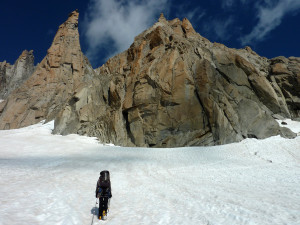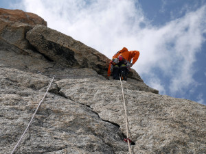 Мы поднялись на первой кабинке Téléphérique de l’Аiguille du Мidi. Пока погода была прекрасная, но белые облачка уже появились. Выбрали самый простой маршрут на Roi de Siam (3693m): Lifting du roi (D+) (L1-5c, L2-5a, L3-5c, L4-4c, L5-5a, L6-5a, L7-4c, L8-4b, L9-5c). Старт нашли легко – просто увидели людей на старте и полезли за ними. Лезем и думаем, что-то как-то не похоже на описание. Слишком просто все, никаких тебе особо 5с. Ну, думаю ладно, вершина видна, раз лезется, то можно лезть по азимуту. Периодами попадались одиноки шлямбура и даже станции. Догнали связку, которая была впереди нас. Спрашиваю, “вы какой маршрут лезете?” Получаю прекрасный ответ “не знаем, мы увидели людей и полезли”. Чудесно, хотя кто бы говорил….. В последствии выяснилось, что лезли мы все правильно – Lifting du roi. Просто после Envers des Aiguilles все казалось таким легким. Пока долезли до вершины тучки стали плотнее. Внизу на леднике с утра стоял палаточный лагерь. Сейчас все палатки свернули. Ждут грозы. Мы тоже долго тормозить не стали, сфотографировались и стали спускаться. На спуске периодами начинал идти мелкий дождик. Я грустно думала о ботинках, оставленных внизу.