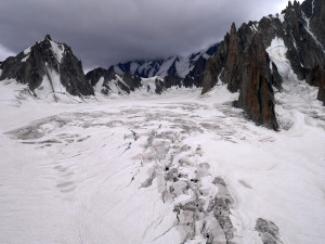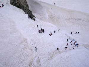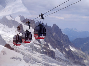 Было мрачно, мокро и холодно. Мы рассчитывали воспользоваться услугами панорамных кабинок, и пересечь ледник на télécabine panoramique. Сейчас кабинки не работали. Это означало переться обратно к станции l’Аiguille du Midi по раскисшему леднику. Еще и под дождем. Но мы решили попробовать. Пришли на станцию подъемника. Поныли там, что мол очень надо на ту сторону. Итальянский дядька сказал подождать и ушел куда-то. Вау! Появилась надежда, что мы все-таки окажемся в Шамони. И спустя пол часа, о чудо! Кабинки запустили. Не для зрителей, желающих насладиться панорамой ледника, а именно для альпинистов, желающих вернуться в цивилизацию. К этому времени погода чуть улучшилась – лить перестало. Народ выполз на ледовые занятия. Мы насладились часовой панорамной экскурсией на кабинках. Еще час и мы внизу в Шамони!