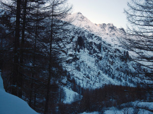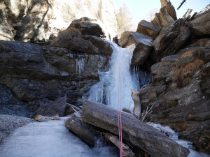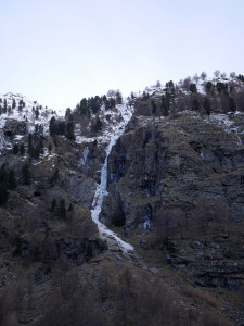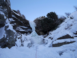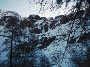 This was our first day in Cogne this season, and we tried to do some investigation of the ice conditions. To warm up a bit, we climbed the small cascade left of Cascade de Lillaz (more like a series of small ice steps along the flow). 2 first pitches we formed. Then we walked further the Lillaz Valley to see that was frozen. At the first glance, without any trace of snow around, nothing seemed to be well formed.