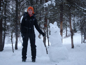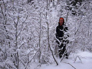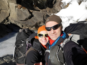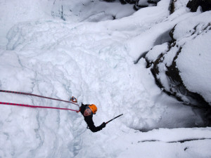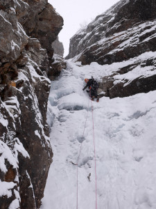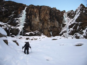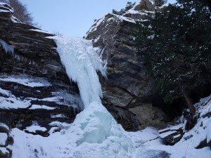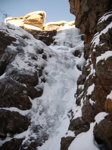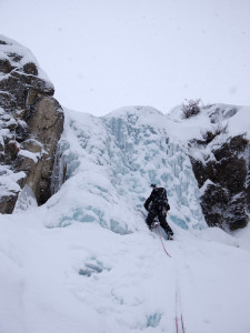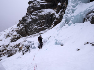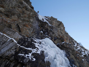 We had to brake a trail up to the fall, but were rewarded with a beautiful and nicely formed cascade. We climbed 4 pitches. The last L5 was partially formed — the exit gets in the sun, and was formed of very thin fragile ice, so we decided not to try it at all.