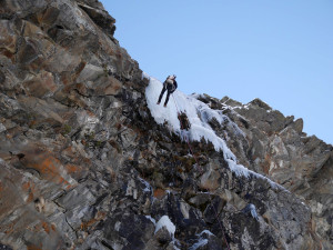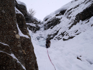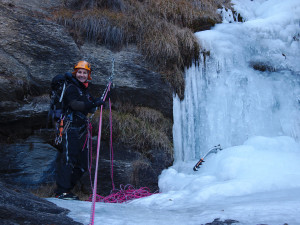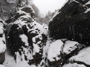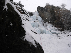 The snowfall started. Winter feeling at last! We climbed Valnontey : L’Acheronte. Entire cascade was formed. Exits of L4 and L5 were though a bit delicate (rocks and snow). Descended by rappel by Patri Droit