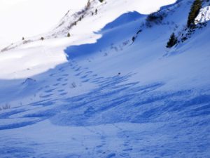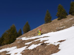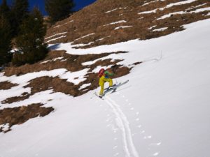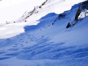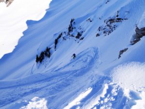 Подъем от поселка Le Chinaillon – Samance (1370 m) сначала на l’Aiguille Verte. Потом пришлось немного спуститься по траве и камням на перевал Col de l’Aiguille Verte (1900m). Перед нами уже кто-то спустился, было видно 2 следа. Прекрасный спуск к озеру Lake de Lessy (1950m) по северному склону. На берегу озера маленький поселок – Refuge de Lessy. Это несколько домиков, в которых зимой никто не живет. Там отлично перекусили, позагорали на солнышке и пошли дальше подниматься на перевал Col de Sosay. Снег под конец практически кончился, но мы ухитрились найти проход в виде снежной змейки, и поднялись на самый перевал не снимая лыж. Дальше опять прекрасный спуск, по северной стороне, где много пуха. Дальше снова подъем на перевал Col du Rasoir (2260m). Скины намокли и снег уже прилично начал подлипать. Когда поднялись на перевал, то на спуск уже вышла тень, так что верхняя часть прилично подмерзла. Ну что ж , это наша плата за долгий сон. Спустились на Col de la Colombière и оттуда выехали в поселок. К машине пришлось подняться пешком еще метров 100.
