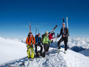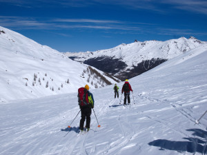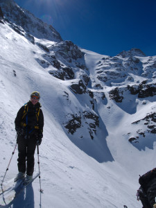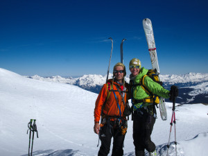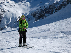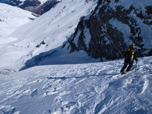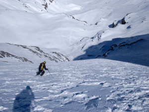 Доминик нам устроил превосходный спуск с довольно крутого склона. Все-таки приятно быть с гидом. Одни бы мы побоялись спуститься с этого склона. 45 градусов, северный склон, лавинная обстановка в этом году не гуд. Вроде и понимаешь, что снег стабильной, но …..