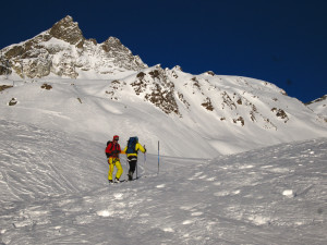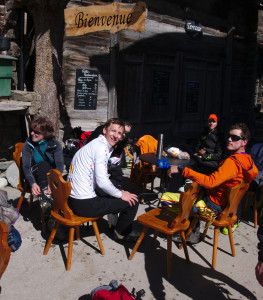 Мы – это команда из 7 человек с замечательным гидом Домиником. Компания у нас была университетская, интернациональная, но говорить старались на французском, в целях изучения и практики языка. Наша цель была зайти на вершинка Pointe de Vouasson по классическому пути, Pointe de Vouasson: Voie Normale. Стартовали из маленькой деревни La Gouille. Там есть небольшой ресторанчик, где можно поесть или просто попить кофе. Поднялись в Сabane des Aiguilles Rouges. Хижина частная, так что скидки альпклубов там не работают. Вообще хижина не очень удобная. Слышно каждое движение в хижине, тапки такие противные резиновые и холодные, которые гремят как колодки. Умывальничка нет. Это понятно, что зимой часто воды нет, но все же обычно есть маленькой умываьничек с зеркалом. Зеркало очень важно для тех, кто носит контактные линзы, так как одеть их с утра, когда фейс опухший не так и просто. Туалет…. Отдельная песня. К туалету надо спускаться метров 50 по протоптанной (и на этом спасибо) скользкой тропе. Идешь, с палками, и жалеешь что ты без кошек. Но, это все мелочи. Главное что у нас была замечательная компания.