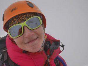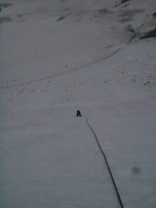 Первые три четверти хребта лезли весело и быстро, а вот затем Олеся неудачным движением потянула в бедре ногу. Хотя лезть мы после этого смогли, но замедлились очень заметно, и на вершину вышли уже после полудня. А вот на спуске уже стало совсем плохо — вместо ожидаемого снежного склона, по которому можно было бы сбежать пешком, мы попали на размякший крутой склон, снег не держался и сходил на каждом шаге обнажая ледовую подложку. Идти стало сложно, а без страховки вообще невозможно, и вкупе с Олесиной больной ногой мы поняли, что спуститься до вечера уже не успеем. Еще и видимость совсем упала – мы попали в тучу, которая зацепилась за вершину.