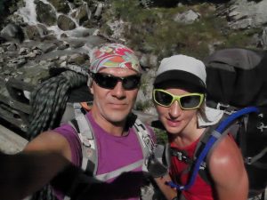 Motörhead – самый простой маршрут на Eldorado. 500 m гранита сложности TD+/6a+. Больших надежд долезть до конца мы не ставили. Во-первых у меня болели ноги после лазания накануне. Во-вторых маршрут не высох после вчерашнего дождя. Ну и в третьих, сегодня снова обещали дождь во второй половине дня. Решили, что долезем докуда получится. До маршрута шли примерно 1 ч 15 мин. Дорога очень красивая, вокруг озера, кругом цветы, водопады. Парочка австрийцев вышла на 1.5 часа раньше нас. Мы очень удивились, увидев ее в конце первой длины. Пока мы возились под маршрутом они сдюльферяли. Сказали, что сложно и они решили не лезть. Лезть сложно и страшно, страховка кладется не везде. На слабах есть редкие шлямбура. Получилось до половины. Ну и так прекрасно. Останется в планах на будущее. До дождя успели вернуться к машине. Дождь был солидный – с градом.