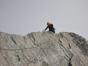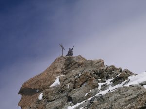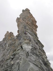 На следующий день пролезли красивый маршрут по хребру Gross Fusshorn : Arête SW. Лезли быстро и весело. Первую часть пробежали не связываясь, вторую с одновременной страховкой. На вершине нашли флажок кантона Вале/Валис. Спуск местами отмечен красными точками, лучше их не пропустить. На маршруте были одни.