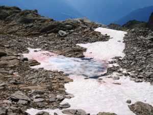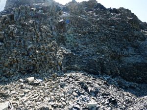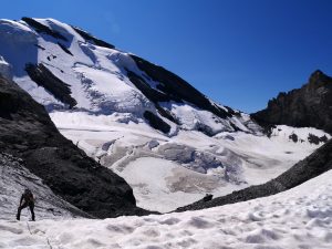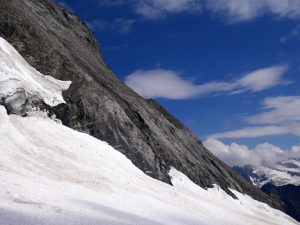 Вниз спускались по классическому пути – Arête Nord-Ouest (PD+). Сначала снежный склон. Он у нас уже был ледяным, но идти без страховки еще можно. Затем рассыпающиеся скалы. Вообще говоря, в Бернских Альпах все рассыпающееся. Так что я еще много раз это повторю – “рассыпающиеся говноскалы”. В общем спуск – реальная жопа. Все время теряешь тропу, тк она отмечена для поднимающихся снизу, а сверху ничего не видно. Поверхность – сыпуха на не очень крутых скалах. Надо хорошо знать маршрут, иначе сбиваешься на сыпуху на крутых скалах. Спускались 2.5 часа. Задрались, пару раз заблудились, я навернулась выдрав кусок скалы (Федя удержал). Скалы мокрые, сверху постоянно течет. Несложные, но противные. Зато видимость хорошая! Тут повезло.