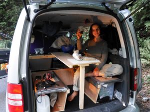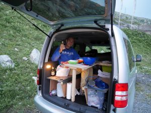 Встали на ночевку в уже знакомом месте – отворот сразу после поворота на хоспис. Уютно устроились в машине. Погода уже испортилась, так что в машине было очень хорошо, еще и шикарный вид на озеро. Приготовили шикарный ужин – стейк из ягненка.
