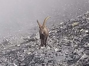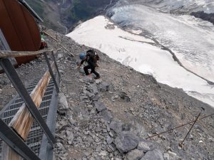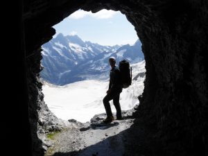Отлично поспали. Никто нас не тревожил. Ночью лил дождь, но не очень сильный. Позавтракали, собрались и поехали в Гриндельвальд. Запарковались у вокзала за 6 франков в день. Билет до станции Eismeer стоит 39 фр с демитарифом. демитриф -это швейцарский льготный тариф, стоит 165 франков на год и позволяет ездить на общественном транспорте за пол цены. Многие подъемники и даже кораблики входят в общественный транспорт, так что это очень выгодно. Особенно если ехать в район Гриндельвальды, где поезд на перевал Юнгфраю стоит очень дорого, 103 франка в один конец! На станции Eismeer надо идти в самый конец поезда, там дверь – вход в туннель. У меня сил не хватило чтобы открыть эту дверь – такой сильный ветер из туннеля. Перед дверью на полу вбит шлямбур 🙂 – видимо чтобы не сдуло, когда дверь открываешь. Проходишь по туннелю и вылезаешь на скальную полку над ледником. К леднику спускаешься по канату, метров 15 наверное. По снегу доходишь до скал. Первые 40 м по скалам самые сложные, но они пробиты. Мы пролезли с одновременной страховкой. Дальше – проще. Тропа до хижины заняла 2 часа. Хижина Mittellegihütta очень уютная и очень маленькая. Нас всего было 25 человек , мы занимали все пространство хижины. Хозяйка Кай (Kai) молоденькая девочка, которая все это разруливает! Реально респект!