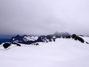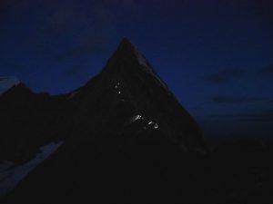 Встали в 4:30, и тупили до 5:45, не очень хотелось выходить в темноте и лезть по мокрым скалам. Поднялись по крутому снегу-льду до перевала. Последние 50м лед уже совсем жесткий. С перевала идут вверх несложные рассыпающиеся скалы. По ним вылезли на хребет.
