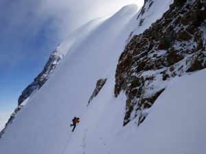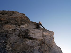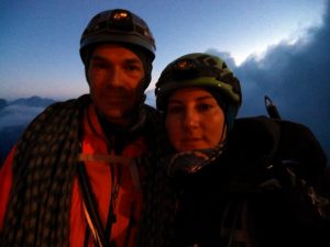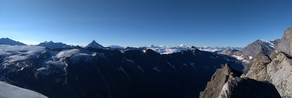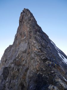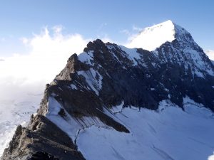 На утро нас поставили завтракать во вторую очередь – в 5:05 ( 🙂 ) иначе слишком много народа полезет одновременно. Мы вышли в 5:30. Перед нами были 7 связок. Постепенно обогнали 3 из них. Лезем мы быстро, но утром тупим долго перед выходом. Лазание очень комфортное – хорошие сухие скалы, тепло, нет ветра. Повешены страховочные канаты, но большой необходимости в них нет. Федя ими не пользовался, я – тоже старалась за них держаться по минимуму. А вот штыри, которыми крепятся канаты, очень помогают. За них удобно вешать страховку. Мы лезли одновременно. Маршрут категорирован как D, но из-за штырей он не сложный. Даже без штырей скалы не выше категории 3. Если обледенеет будет менее приятно. Перед вершиной мы обогнали еще одну связку. На вершине были в 7:30, те пролезли все за 2 часа! Это очень быстро -по книжке на маршрут отводили 4-5 часов. Потупили чуток на вершине. Мы спускались в сторону Monchjochhütte по южному ребру – маршрут Arête sud категории AD. Это довольно длинный хребет местами с ледяными кусками. Первую часть спуска можно дюльферять. Все так и делали – быстрее получается. Затем хорошие скалы. В книжке на спуск отводилось 5-6 часов. Мы спустились за 3, но у нас были очень хорошие условия и мы очень быстро двигались. А так, маршрут очень даже честная AD. Можно спуститься по маршруту Variant ouest к станции Eigergletscher. Он тоже AD, но менее очевидный, чем наш. Хотя в нем есть плюс – существенно экономишь на цене за билет.
