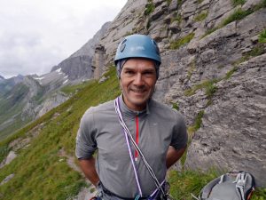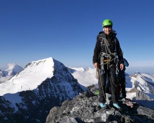Начало маршрута найти в темноте очень сложно, надо знать или посмотреть заранее. Старт – траверс по наклонным скалам на ледник Untere Oeschinengletscher. На траверсе есть страховочный трос, что очень помогает, особенно если скалы мокрые или обледенелые. Траверсишь ледник и залезаешь на скалы. К этому времени рассвело, что было очень нам кстати, тк сход с ледника не очевиден. Залезание на скалы с ледника – это наверное самое сложное место маршрута. Дальше по сыпухе, рассыпающимся скалам и прочему го…ну поднимаешься с вершинному хребту Oeschinenhorn. Скалы отвратительные, рассыпающиеся, неинтересные, но несложные. Маршрут кое-где отмечен турами, лучше его не терять. Пролезть можно везде, но по маршруту сыпет меньше. Последняя четверть маршрута – скалы получше. Вообще, думаю, что рано по сезону , когда все обледенелое, этот маршрут сложнее, но интереснее. Залезли на Oeschinenhorn (3486м) за 4.5 часа, сфоткались, поели и полезли дальше. Хребет между Oeschinenhorn и Blüemlisalphorn (3657m) рассыпается чуть меньше, но все равно не гуд. Скалы простые. Прошли его за 1.5 час. Те в сумме до вершины Blüemlisalphorn долезли за 6-6.5 часов. Вниз спускались по классическому маршруту на Blüemlisalphorn – Arête Nord-Ouest (Blüemlisalphütte), категории AD. Спуск сначала нормальные скалы, затем уже привычные рассыпающиеся скалы, сыпуха и грязь :). Ледник закрыт, но снег не сильно растаял, так что вполне нормальные условия. Ледник открыт. В хижине были в 14:30, те маршрут занял 10 часов. В принципе как акция “траверс” , это интересно. Длинная, долгая и разнообразная AD с очень красивыми видами на все Бернские Альпы и горы в районе Цермата. Но рассыпающиеся скалы задолбали. В хижине просушили барахло и пошли вниз, хотелось успеть в магазин за вином и сыром. Очень красивая дорога вниз – вообще, эта часть Альп очень красива.