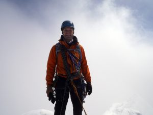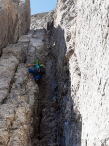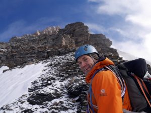 Хребет тоже слегка рассыпается, но в целом интересный и несложный. В общем , как и написано D-, если скалы сухие. Если лед , будет сложнее. У нас льда не было, только несколько ледяных кусков. Погода – отличная, солнце, нет ветра, тепло. Скала подсыхает. Мы не торопились, все равно одни на маршруте. Но пролезли за 4.5 часа, что достаточно быстро. Книжка обещала 4.5-6 часов. На вершине очень приятно – есть укромное место для обеда и отдыха на солнышке и без ветра.