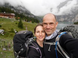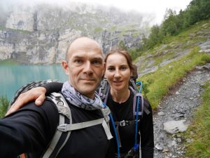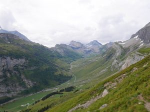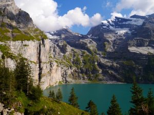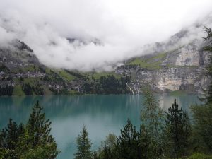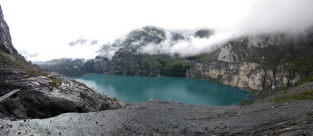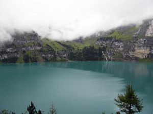 Вышли уже ближе к 4 дня, когда дождь таки прекратился. Поднялись на лыжном подъемнике (10 франков) и пошли. Тропа легкая и очень красивая. В начале напоминает что-то среднее между Карелией и Коста Рикой :). Виды потрясающие. Тропа сначала идет вокруг озера Oeschinensee. Затем забирает наверх и открываются виды на озеро сверху. Вокруг бесчисленные водопады один красивее другого – не даром зимой Кандерстег – это рай для ледолазов. Последние 250 м до хутты мы прошли в туче – влажно и темно. Но в целом дождь нас не замочил.